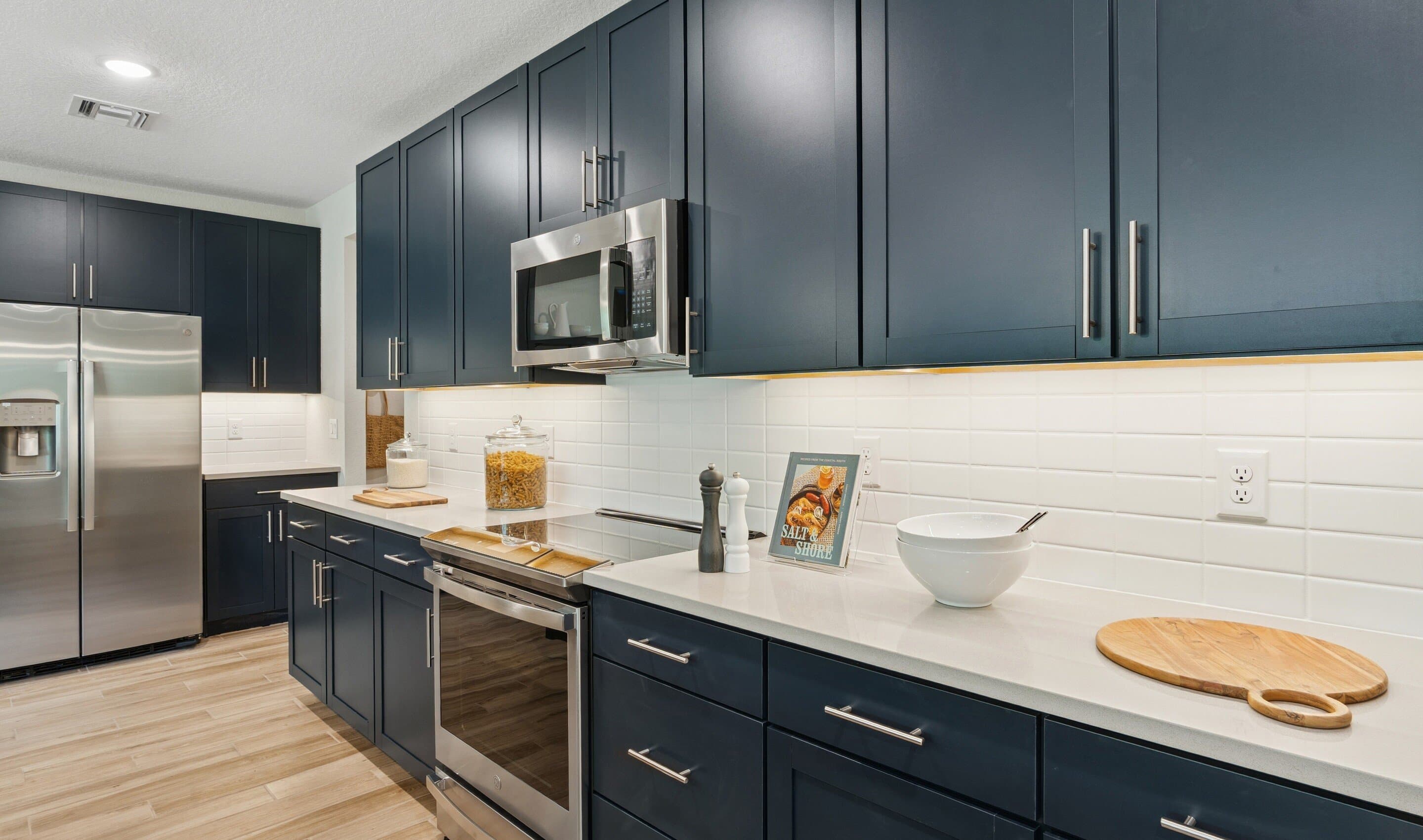 Kitchen with blue cabinets and quartz countertops