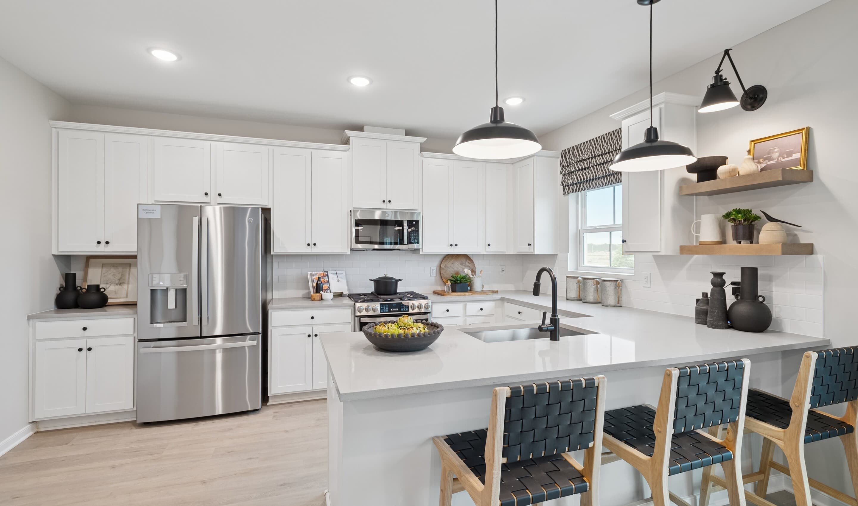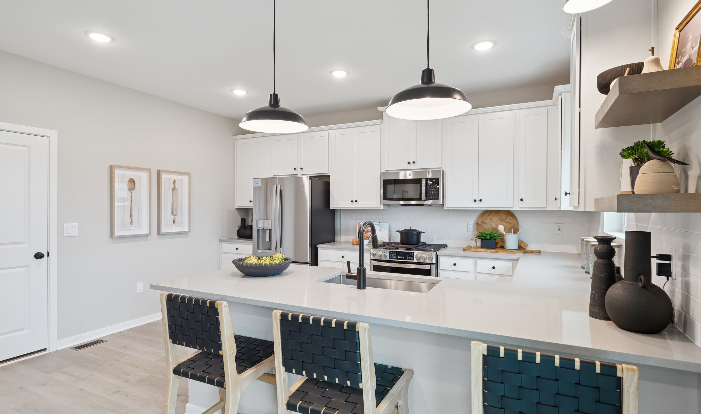 - Breathtaking kitchen featuring Elkins White cabinetry & pendant lights